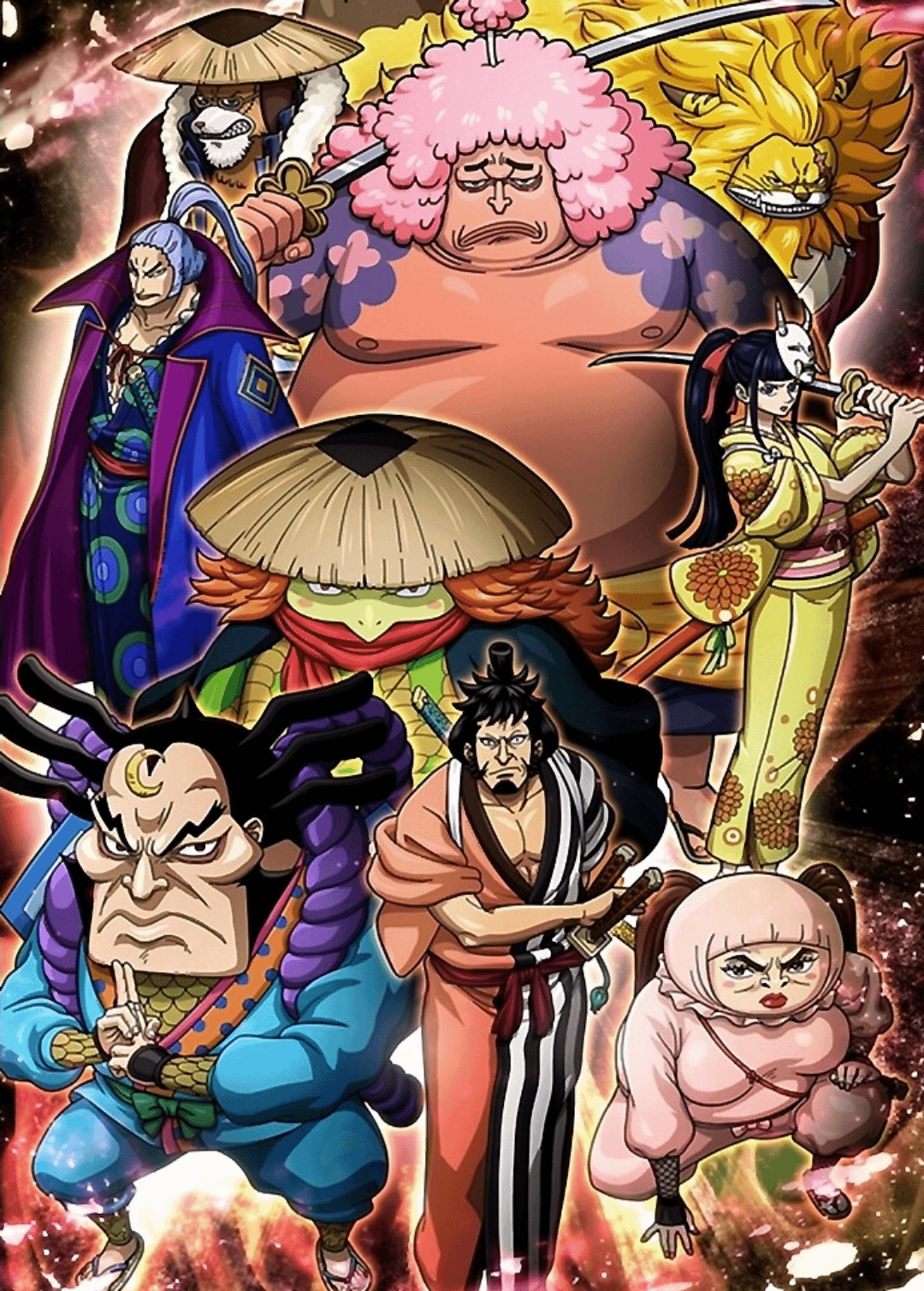 After his legendary journey sailing as a member of the Roger Pirates, Oden returned to Wano to find his homeland under threat. His tragic execution by Kaido became a pivotal moment in One Piece history, inspiring the Ninja-Pirate-Mink-Samurai Alliance to rise against the tyranny oppressing Wano. His legacy continues through his son and the loyal Nine Red Scabbards who carry his dream of opening Wano's borders.